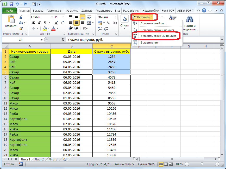 Как видим, строки выстроились в прежнем порядке, исключая пустые, которые удалены. Теперь, нам осталось только удалить добавленный столбец с порядковыми номерами. Выделяем этот столбец. Затем кликаем по кнопке на ленте «Удалить». В раскрывшемся меню выбираем пункт «Удалить столбцы с листа». После этого, нужный столбец будет удален.