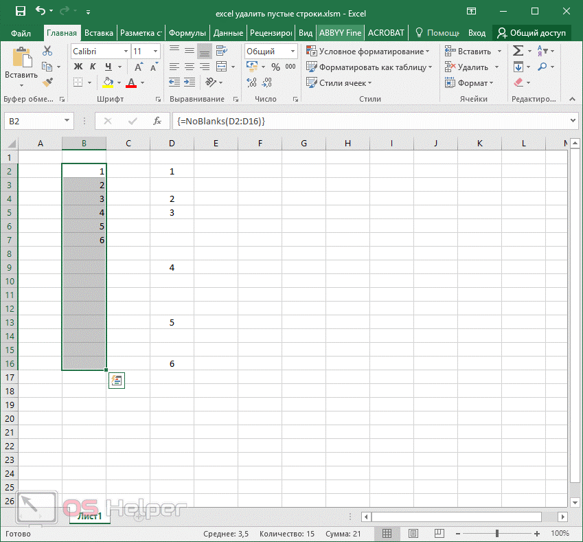 Шаг 9. Зажимаем комбинацию «Ctrl+Shift+Enter». В результате имеющиеся данные должны скопироваться без пробелов, как это показано на следующем рисунке: