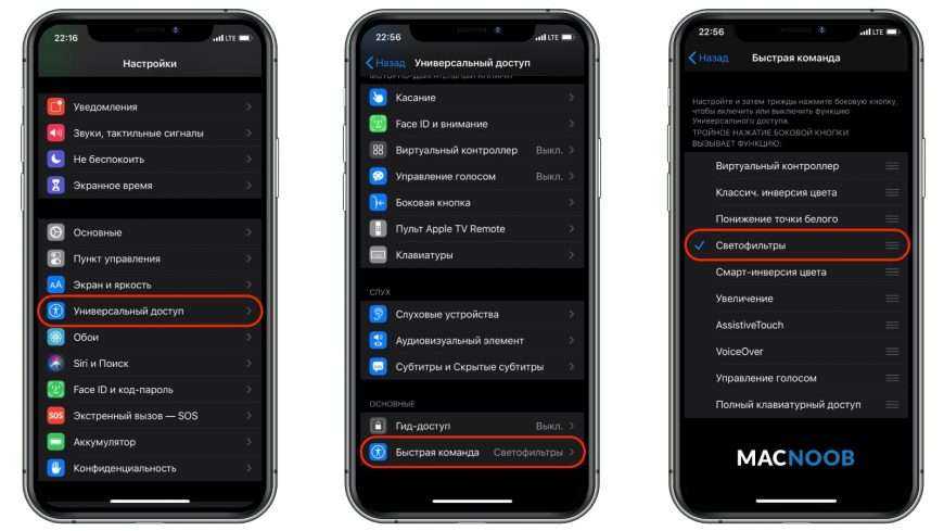 Если слева от названия функции «Светофильтры» стоит галочка, это означает, что вы можете включать чёрно-белый режим трижды щёлкнув боковую кнопку либо кнопку «Домой».