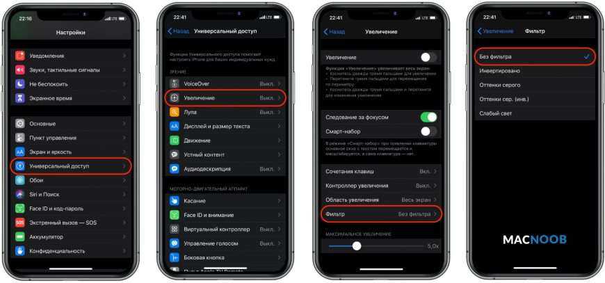 Если ваш iPhone всё ещё чёрно-белый, откройте «Настройки», перейдите в Универсальный доступ → Увеличение → Фильтр и выберите значение «Без фильтра».