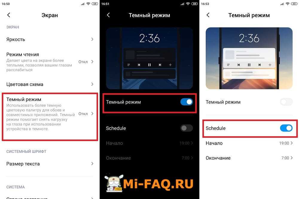 Шаг 2: в новом окне выбрать функцию «Темный режим» и кликнуть по ней. Далее надо переключить ползунок в режим «Вкл». Также включать ночной режим на Xiaomi можно по расписанию с помощью опции «Schedule».