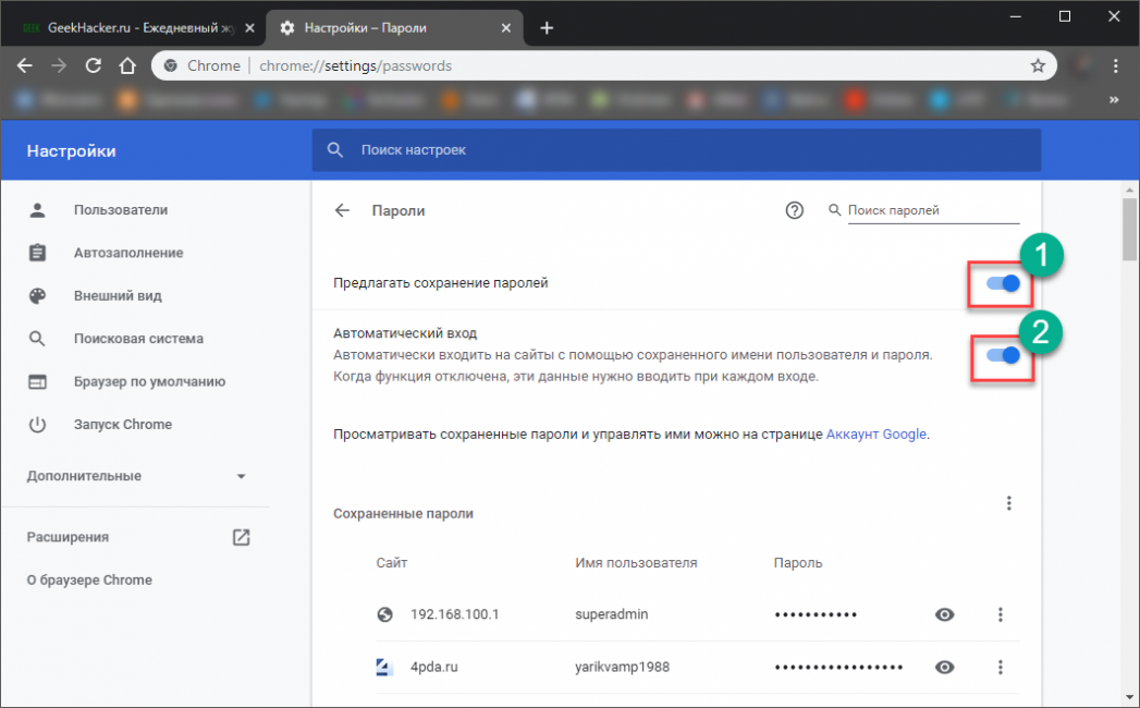 Теперь передвигаем ползунки напротив пунктов Предлагать сохранение паролей и Автоматический вход в положение Вкл