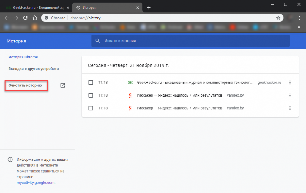 В настройках браузера можно удалить всю историю, если хотите стереть только отдельные фрагменты, выполните следующие действия.