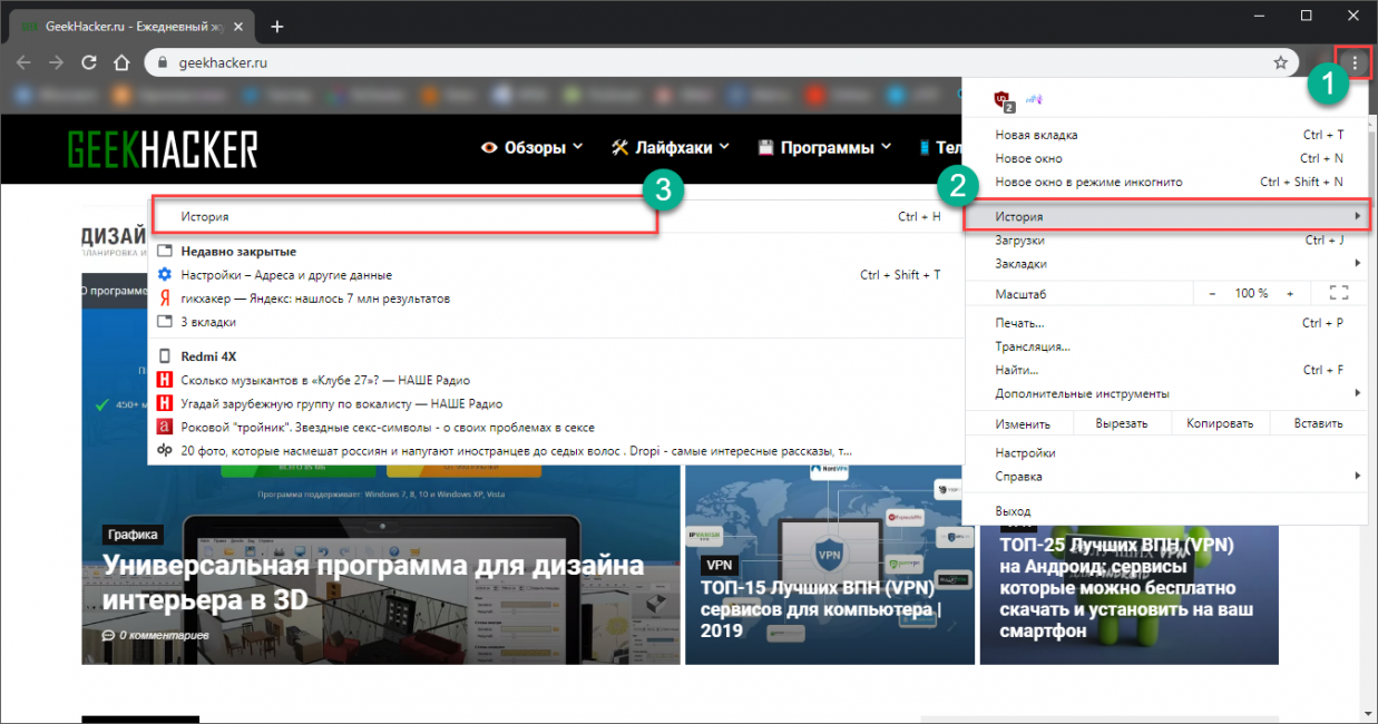 Для начала нам придется удалить все данные. Открываем Хром, кликаем по кнопке с тремя точками, выбираем История и затем снова кликаем История в следующем меню. Добраться до нужного окна настроек можно и при помощи сочетания Ctrl+H