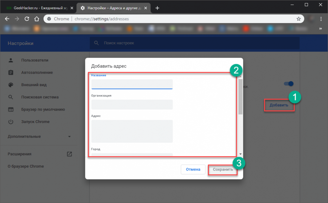 - В Google Chrome хранятся сведения о вашем адресе . Во время первого заполнения формы Google Chrome автоматически сохраняет введенную контактную информацию, например имя, адрес, номер телефона или электронный адрес как запись автозаполнения. Можно хранить несколько адресов как отдельные записи.