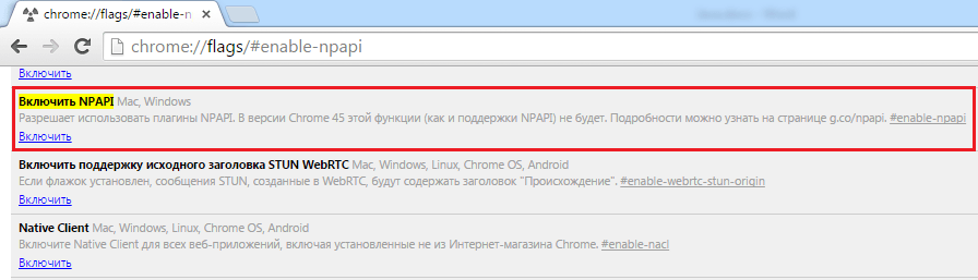 Вернуть поддержку этому плагину довольно просто. Первым делом необходимо будет ввести в адресной строке обозревателя chrome://flags/#enable-npapi