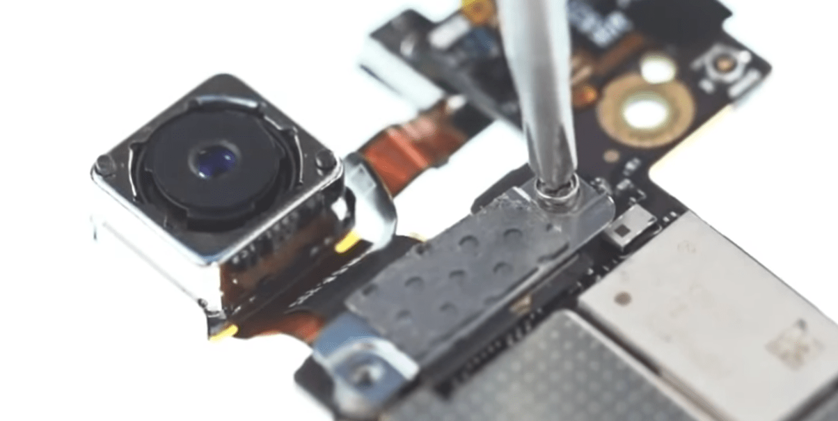 Открепите заднюю крышку от дисплея, используя пятигранную отвертку, медиаторы и лопатку для отключения шлейфов материнской платы. Затем извлеките плату. В верхней её части найдите установленный модуль камеры и открепите винты его заглушки. Отключите шлейф с помощью спуджера и выполните замену компонента. Соберите телефон.