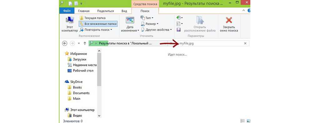 - Ввести ключевой запрос (имя файла) в строке поиска, расположенной в правом верхнем углу активного диалогового окна. Если поиск не даст результатов, то перейти к следующему шагу.