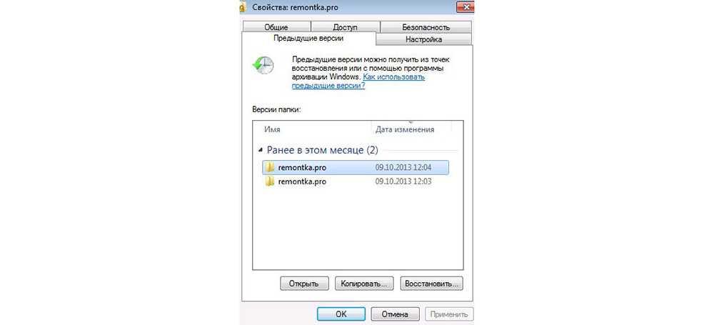 В Windows 7 даже без специальных настроек можно обнаружить резервные копии стертых файлов: достаточно щелкнуть правой кнопкой мышки по папке, в которой ранее содержалась удаленная информация, и выбрать опцию «Показать предыдущую версию». На экране отобразится окошко «Свойств». Во вкладке «Предыдущие версии» хранятся резервные копии папки. Чтобы проверить содержимое фолдера, нужно кликнуть на интерактивную кнопку «Открыть»: отобразится список файлов. Останется разыскать необходимый среди них и переместить его в надежное место. Для быстрого отката папки до момента удаления данных достаточно нажать на клавишу «Восстановить…». При этом все данные, которые были перемещены в папку до момента создания резервной копии, будут удалены.