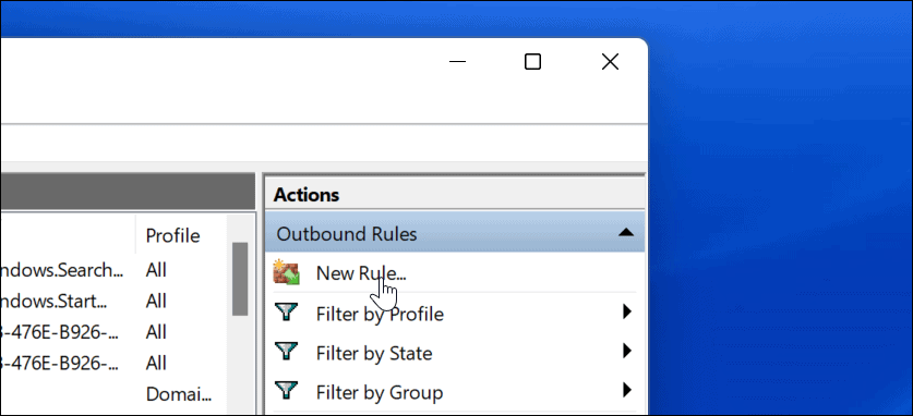 - Выбирать Исходящие правила на левой панели, затем справа нажмите Новое правило под Действия.
