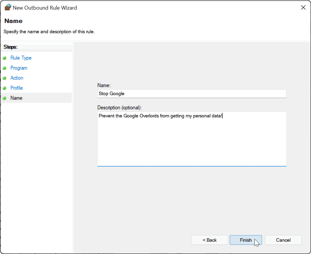 - Введите имя для правила брандмауэра, например Заблокировать Google и добавьте описание. Имя правила обязательно, но описание не обязательно. Когда вы закончите, нажмите кнопку Заканчивать кнопка.