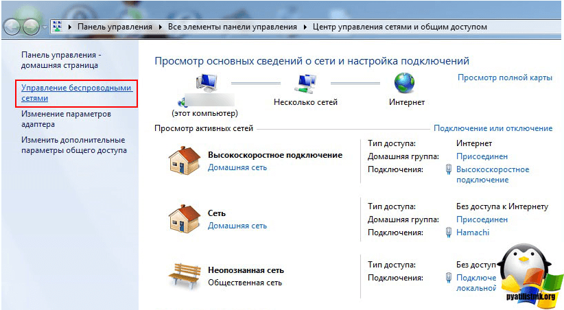 У вас откроется Центр управления сетями и общим доступом, где далее нужно перейти в Управление беспроводными сетями.