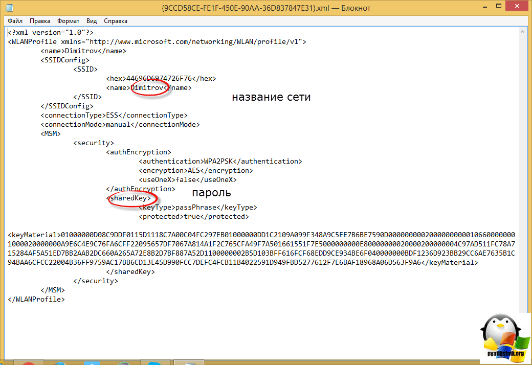 Если вы откроете любой из них, то увидите стандартный синтаксис xml, в котором в поле SSID название и есть пароль в поле sharekey.