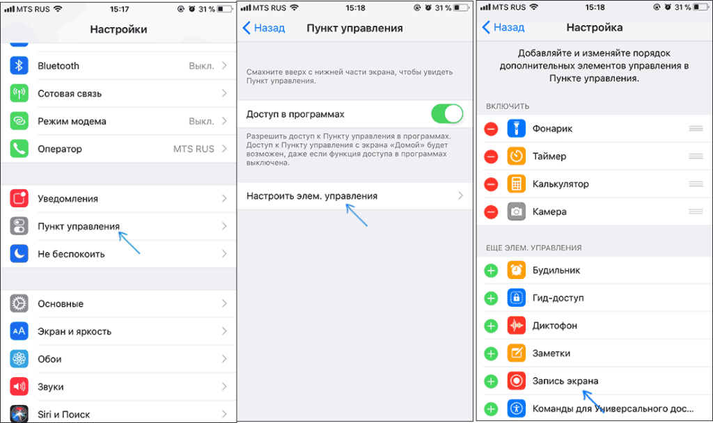 - В открывшейся вкладке можно выбирать инструменты, которые будут располагаться в меню быстрого доступа, то есть в «Пункте управления». Вы можете изменять порядок расположения утилит, а также добавлять новые сервисы из списка. Нас интересует строка «Запись экрана», слева от которой нужно нажать по кнопке «+».