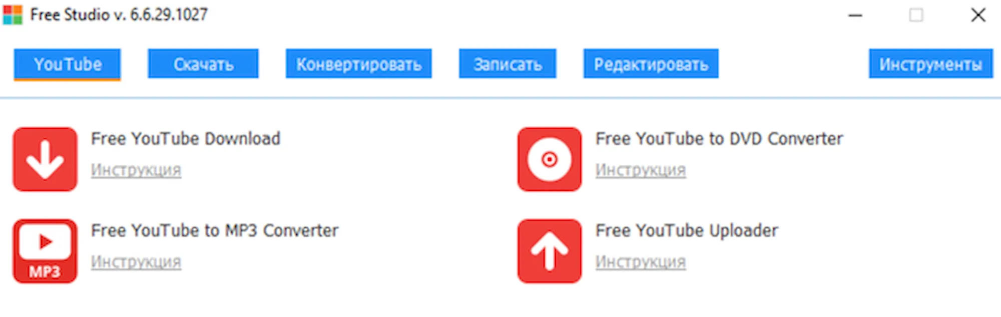 Free Studio можно определить как набор отдельных модулей для преобразования аудио-видео, которые обеспечивают программу очень многими возможностями. В дополнение к изменению популярных форматов для мобильных устройств, таких как iPod, PSP, iPhone и BlackBerry, Free Studio успешно загрузит контент с сайта YouTube (в том числе в высоком разрешении) и поможет отправить свои материалы на платформу.