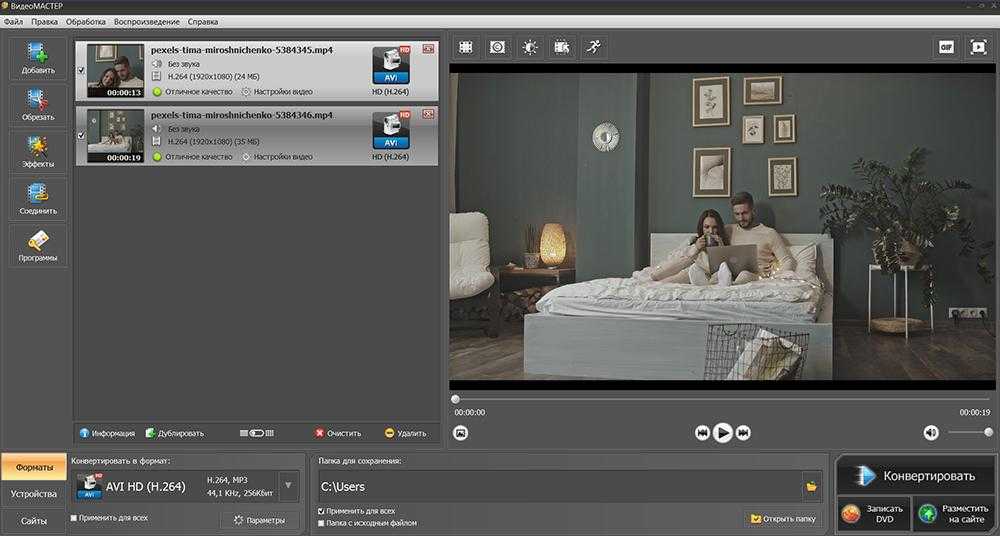 ВидеоМАСТЕР поддерживает вывод в AVI, MP4, MKV, WebM, FLV, MOV и т.д. Также можно перевести DVD в AVI, извлечь звук или записать материал на диск. Помимо этого программа предоставляет готовые профили для мобильных устройств, игровых приставок, плееров, планшетов и Apple TV, сайтов YouTube, ВК, Vimeo, MySpace и т.д.