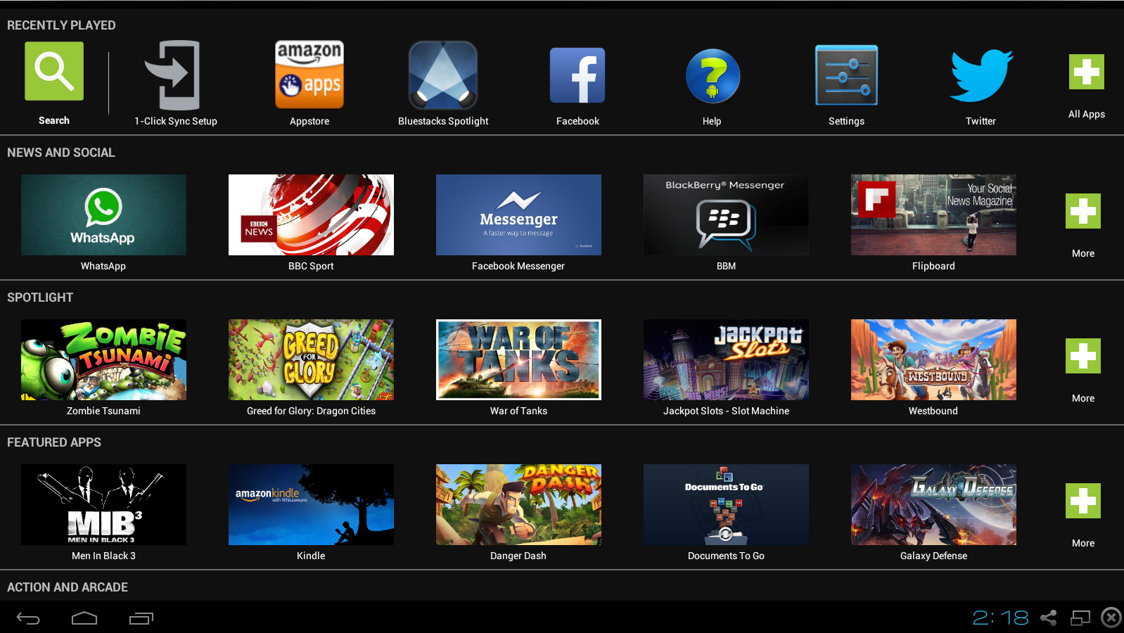 В комплект поставки эмулятора входит несколько приложений и игр (видимо, спонсорских), в частности, Facebook, Lineage 2 и Pokemon Go.