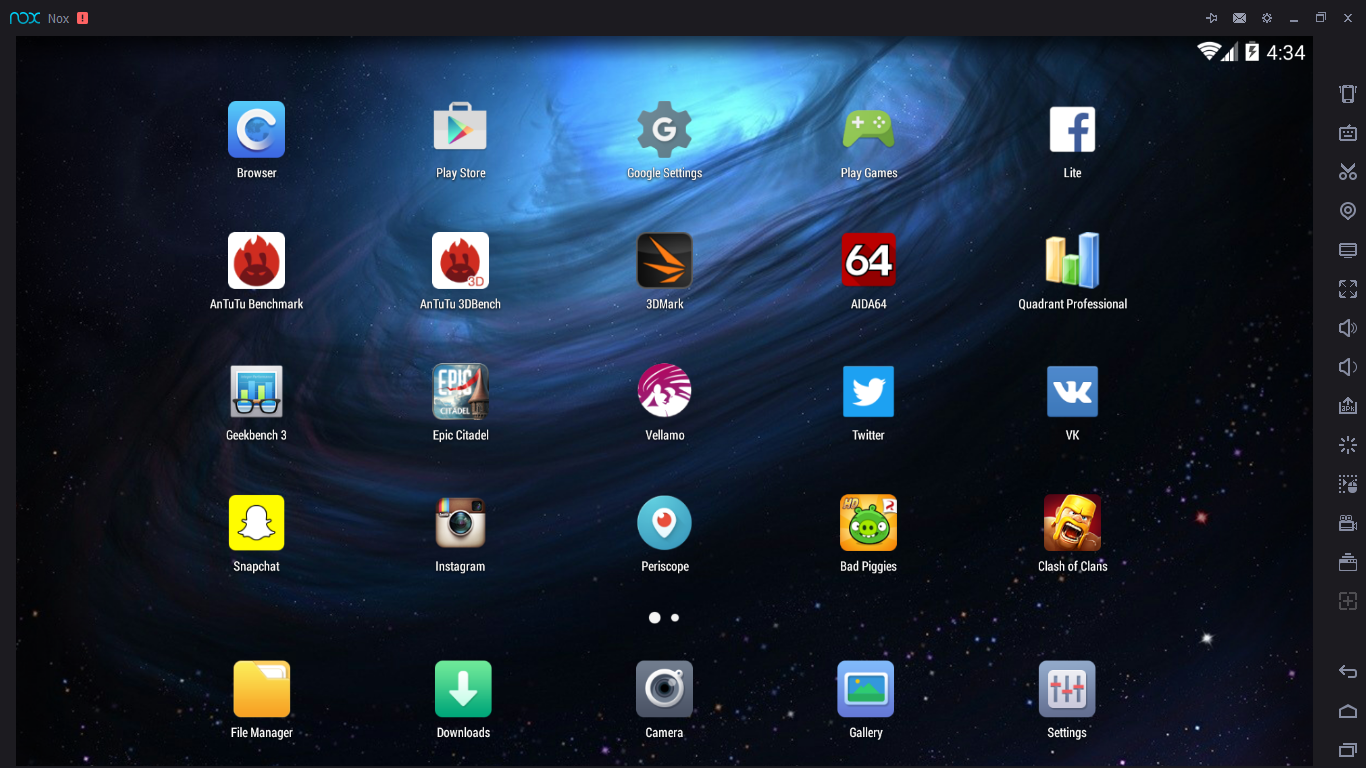 В результатах тестов нет ничего выдающегося. Грузит систему меньше, чем BlueStacks (и это после установки в настройках Full HD разрешения и назначения эмулятору двух ядер процессора). Браузер Chrome, запущенный в хост-системе, подвисает не очень сильно, в Word и проводнике почти отсутствуют фризы. NOX смог запустить все приложения, которые запускал BlueStacks. Работают эти приложения заметно шустрее, чем у конкурента. Браузер, установленный «из коробки», работает довольно сносно, но при скроллинге страница все равно чуть-чуть подвисает.