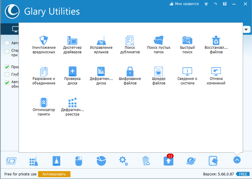 Glary Utilities Free — бесплатное приложение-комбайн для оптимизации компьютера. В его наборе — более тридцати утилит на все случаи жизни, причем некоторые из них уникальны для продуктов такого класса или встречаются только в платных версиях. Например, поиск и удаление spyware (шпионского программного обеспечения), проверка обновлений установленных на компьютере программ, шифрование файлов, оптимизация памяти, разрезание и объединение файлов и т. д. Список часто используемых утилит показан на скриншоте вверху.