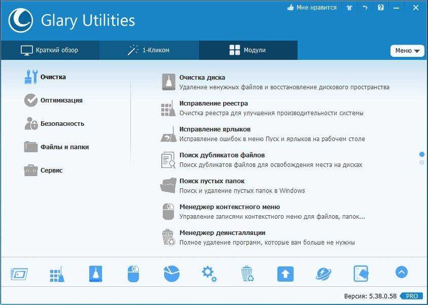 Раздел «Модули» содержит все компоненты (утилиты) программы, которые пользователь может запускать отдельно — по мере надобности. Сюда входят средства очистки, управления дисковым пространством, файлами и т. д. В нижней панели всех вкладок главного окна размещены кнопки быстрого вызова некоторых из них.
