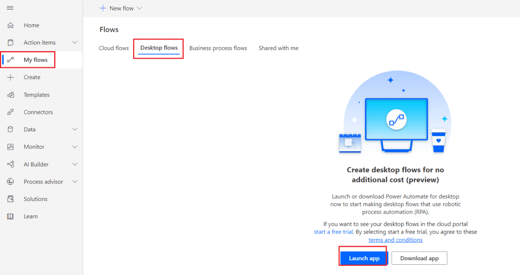Else, we can create a Desktop Flow in the Power Automate portal, so click on My Flows -> Desktop Flows-> Launch App.