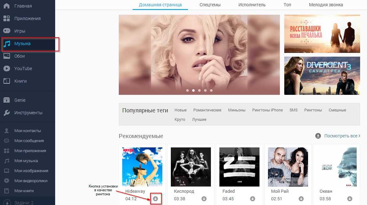 Музыкальные композиции можно прослушать в окне приложения и сразу же установить в качестве рингтона на телефон.