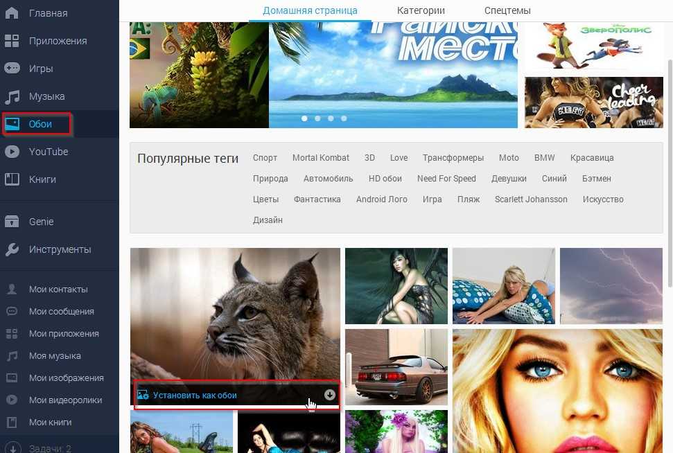 Далее идут разделы отдельно для скачивания игр, музыки, обоев на рабочий стол, YouTube (странный подход) и книг. Интерфейс этих вкладок и их содержимое очень похоже на раздел приложений.