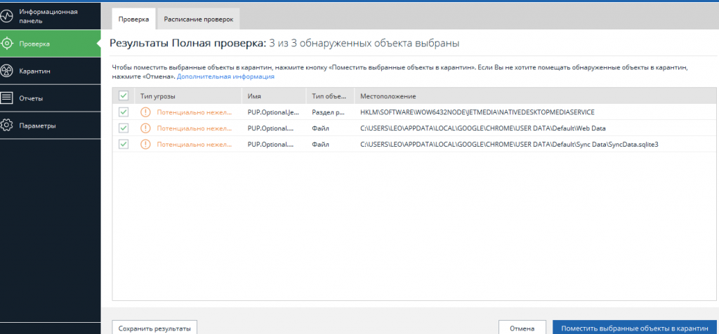 Теперь вам осталось кликнуть по кнопке в правом нижнем углу и переместить объекты в карантин.