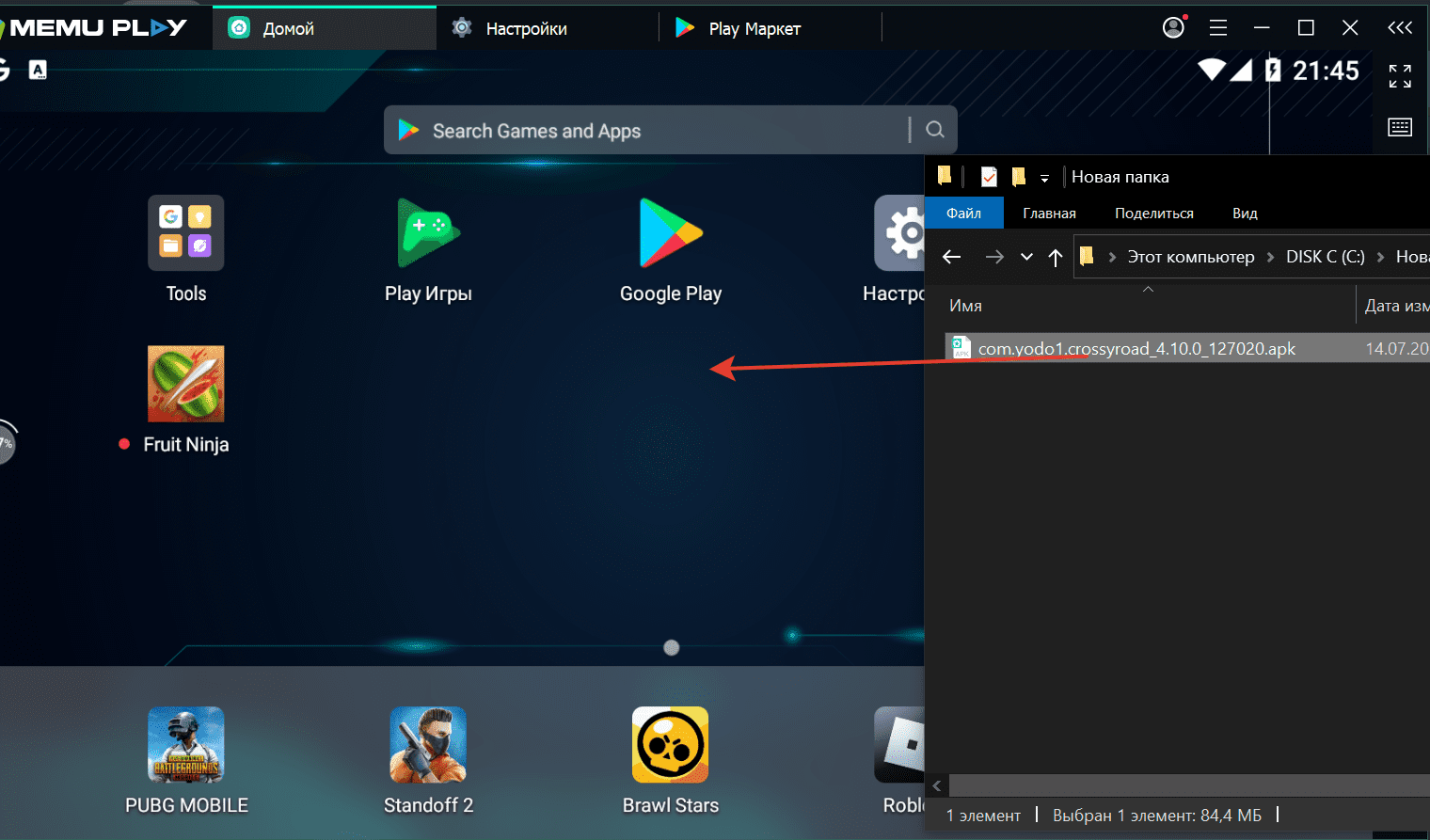 Запустить игру можно и из файла на ПК. Для этого выйдите с сеть и скачайте АРК, установив на компьютер. Далее после запуска эмулятора в правом части экрана нажмите на иконку файла и установите игру. Но учитывайте, что загрузка игры со сторонних ресурсов может быть опасна для ПК.