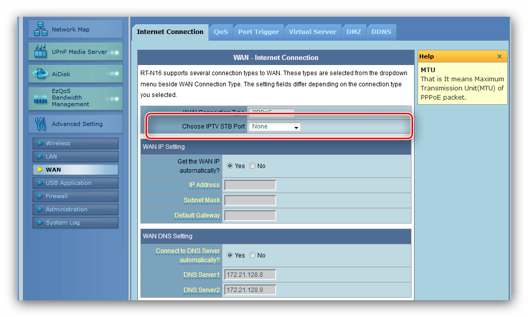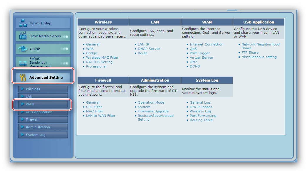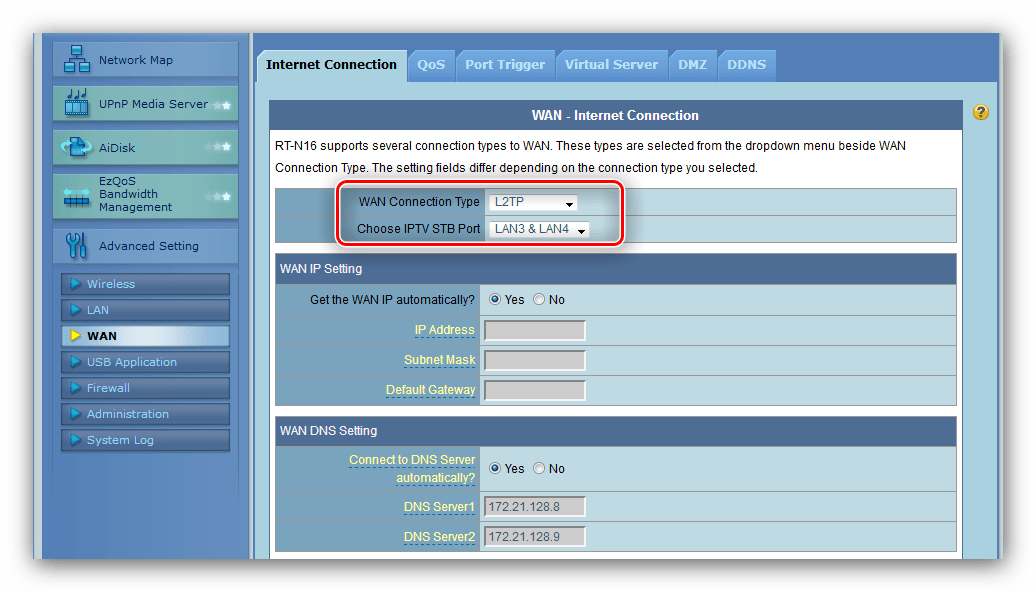 - На странице настроек Asus RT-G32 в меню слева выберите пункт «WAN», в результате чего Вы увидите страницу настроек подключения к Интернет.