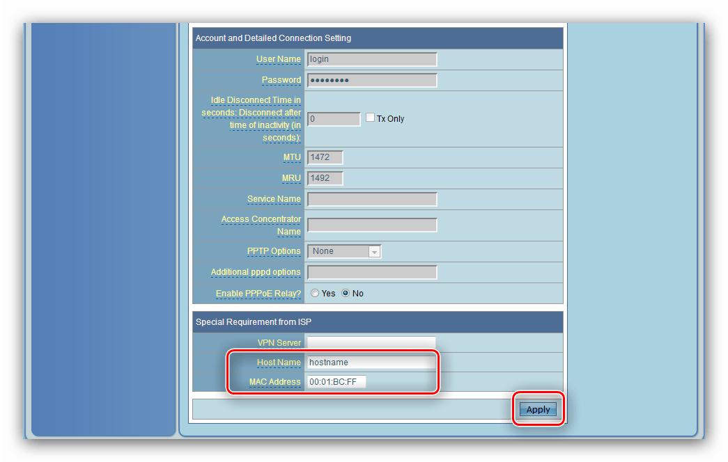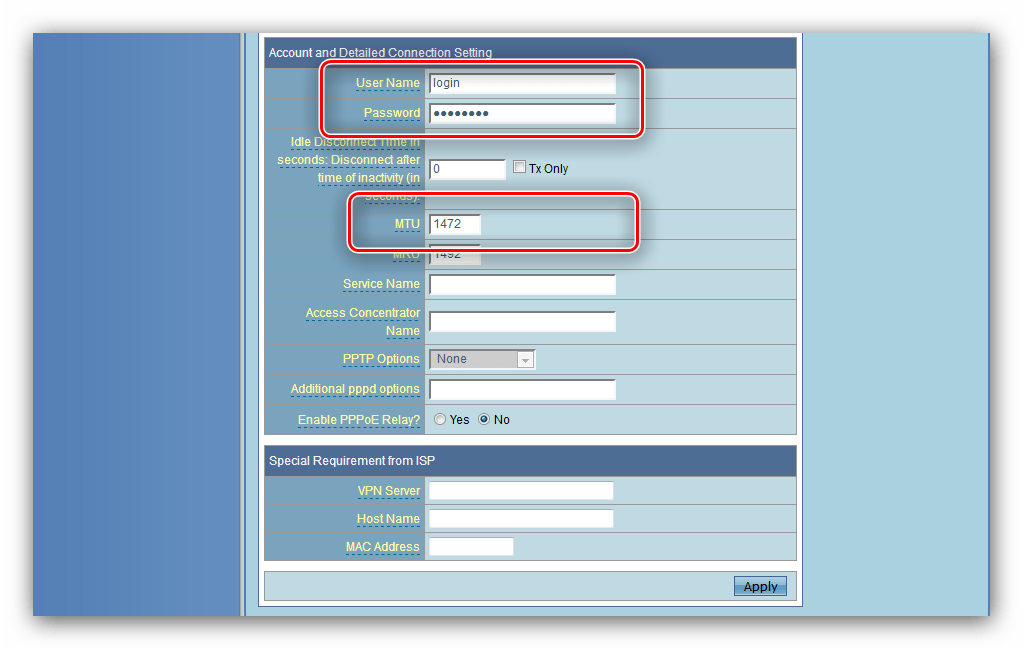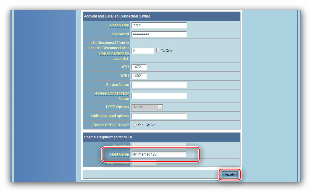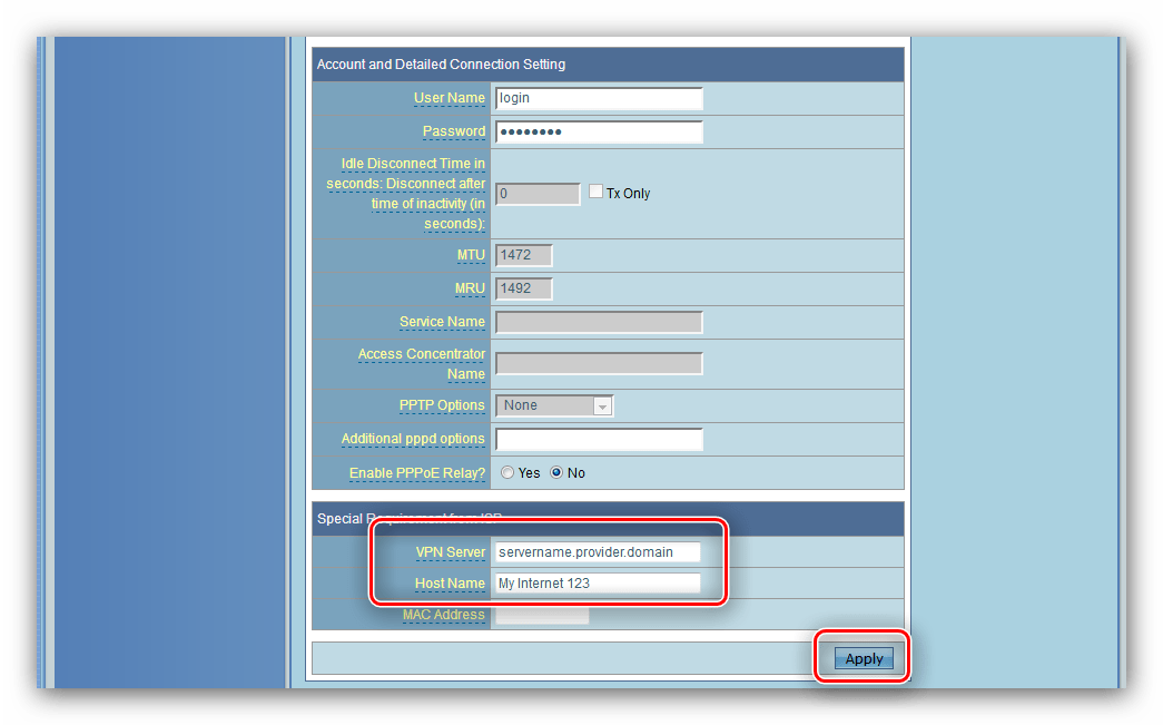- в полях учетной записи требуется указать ваш логин и пароль, выданный провайдером;