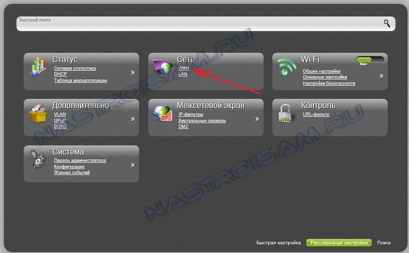 В меню расширенных настроек роутера выбираем раздел Сеть > WAN: