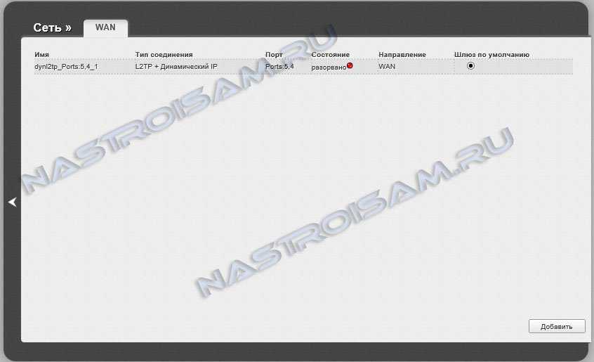 Попадаем в раздел настройки внешнего соединения WAN. Нажимаем кнопку Добавить для создания подключения к Интернет::