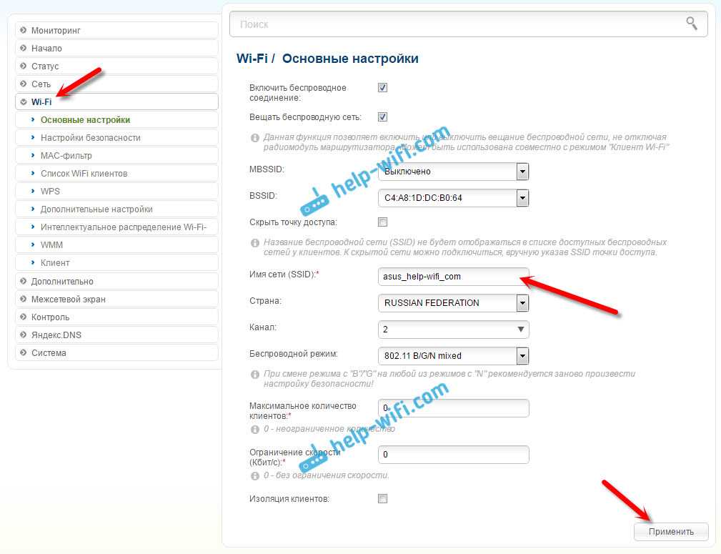 - На странице основных настроек беспроводной сети можно указать имя своей сети SSID, задав что-то, отличающееся от стандартного DIR-300. Это поможет Вам отличать свою сеть от соседских. Остальные настройки в большинстве случаев изменять не нужно. Сохраните настройки и вернитесь на предыдущую страницу.