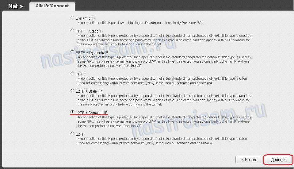 В случае Билайн — выбираем «L2TP+Dynamic IP»: