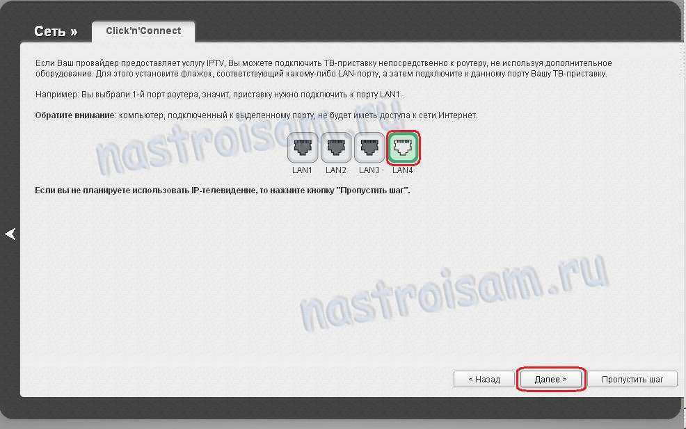 Выбираем порт для STB IPTV-приставки и нажимаем Далее.Примечание: Этот вариант настройки IPTV подходит только в том случае, если провайдер для доставки IPTV не использует VLAN. В противном случае — смотрите ниже продвинутый вариант настройки.