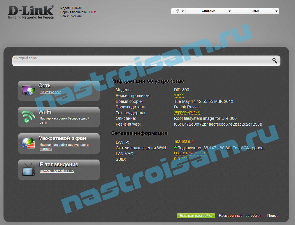 Для базовой настройки WiFi-роутера DIR-300/A/D1 можно воспользоваться встроенным мастером настройки «Click’n’Connect». Его возможностей с лихвой хватит для настройки подключения к Билайн, Дом.ру, ТТК и большинства филиалов Ростелеком. Я намеренно скрою такой вариант настройки под спойлер, чтобы поподробнее остановиться на продвинутом варианте настройки. Если же Вам нужно проще и быстрее — разверните спойлер: