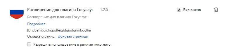 - В списке находят «Расширение для плагина Госуслуг». Нужно убедиться, что флажок «Включено» активен.