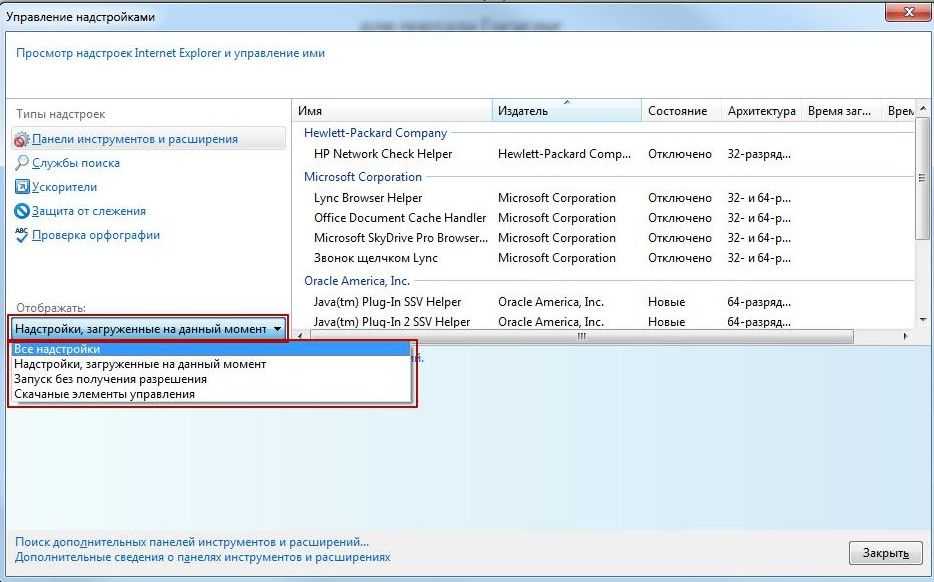 - В списке «Надстройки, загруженные на данный момент» выбрать первый пункт (всё). Далее в перечне найти Crypto Interface Plugin от Rostelecom PAO и включить его, кликнув по статусу правой кнопкой мышки и выбрав соответствующее значение.