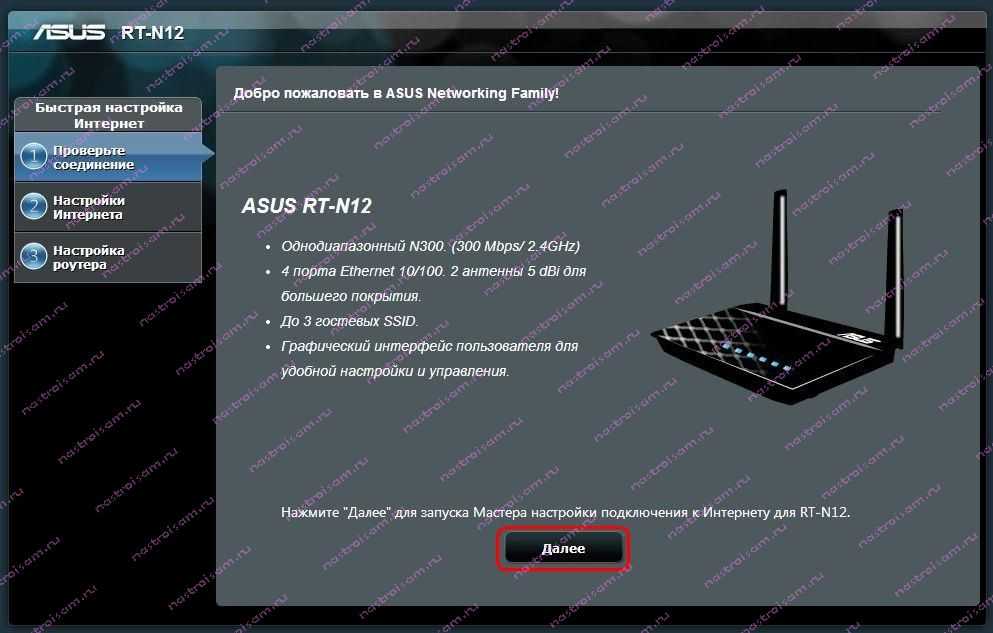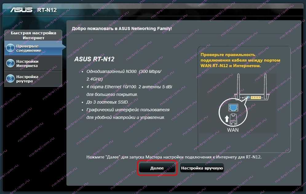 Установка параметров роутера RT-N12 D1 по прежнему возможна как через отдельный мастер — пункт «Быстрая настройка Интернет». Он представляет собой инструмент самой базовой конфигурации маршрутизатора. Он очень простой и пошаговый, с неплохим описанием. Поэтому, я скрою его в спойлер.