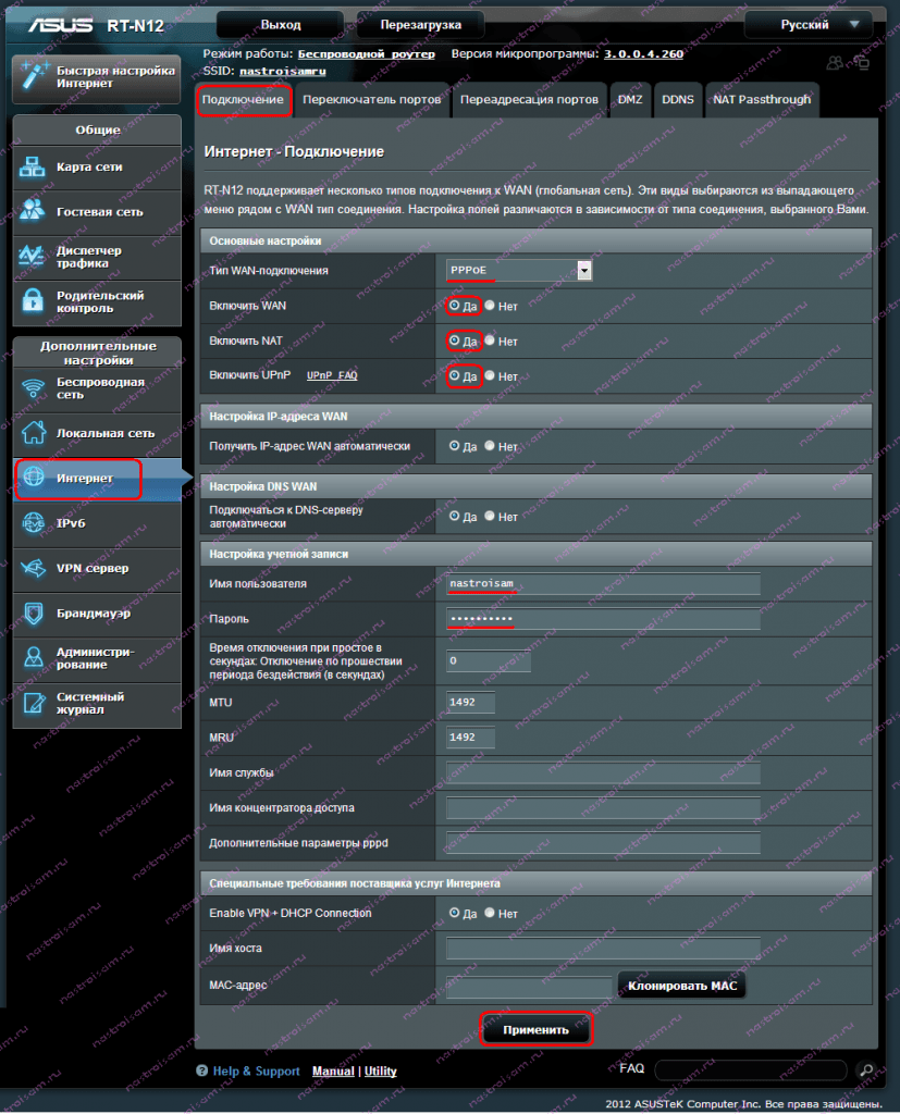 Для настройки Asus RT-N12 D1 для подключения по PPPoE, надо выбрать соответствующий пункт в списке «Тип WAN-подключения». Поставить галочки «Включить WAN» — «Да», «Включить NAT» — «Да», «Включить UPnP» — «Да».