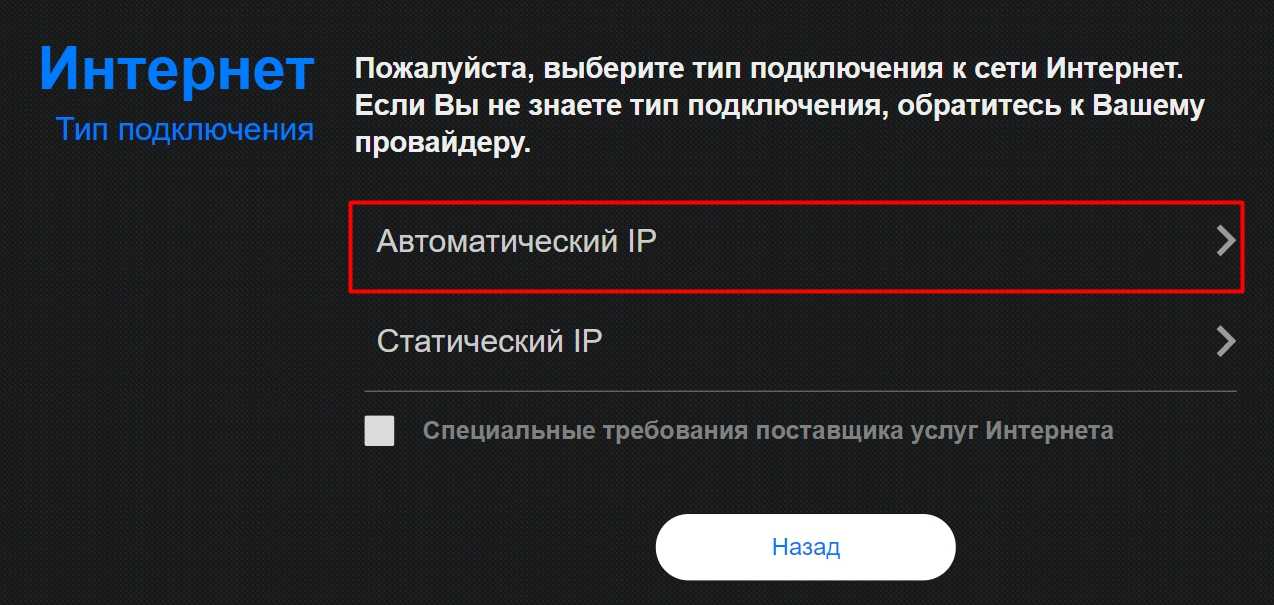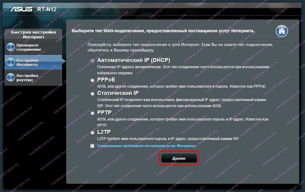 Если Вы не знаете какой у Вас тип — уточните это в техподдержке провайдера. Выбираем нужный тип, нажимаем Далее.