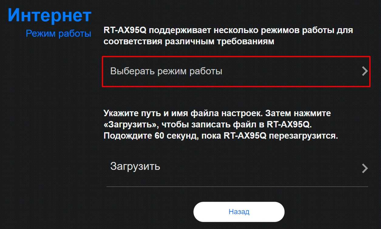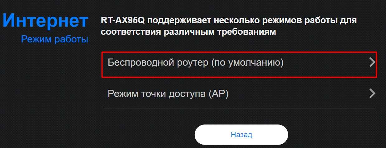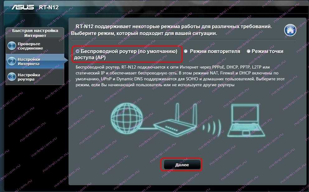 На этом шаге роутер просит указать в каком режиме он будет работать — оставляем по умолчанию вариант «Беспроводной роутер». Нажимаем кнопку Далее.