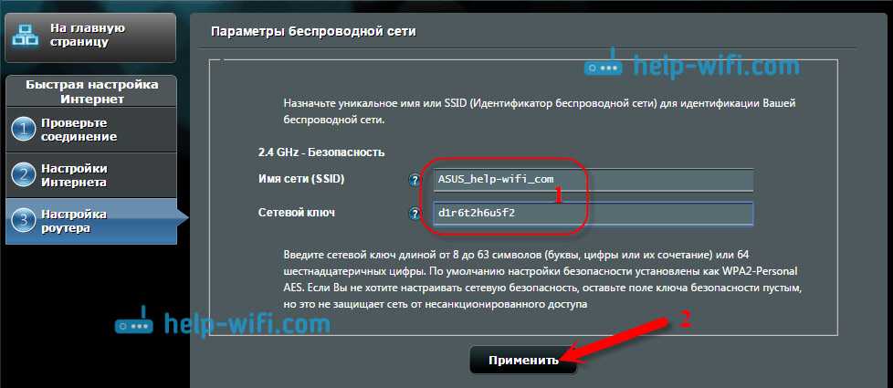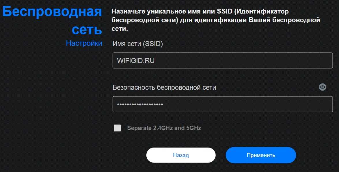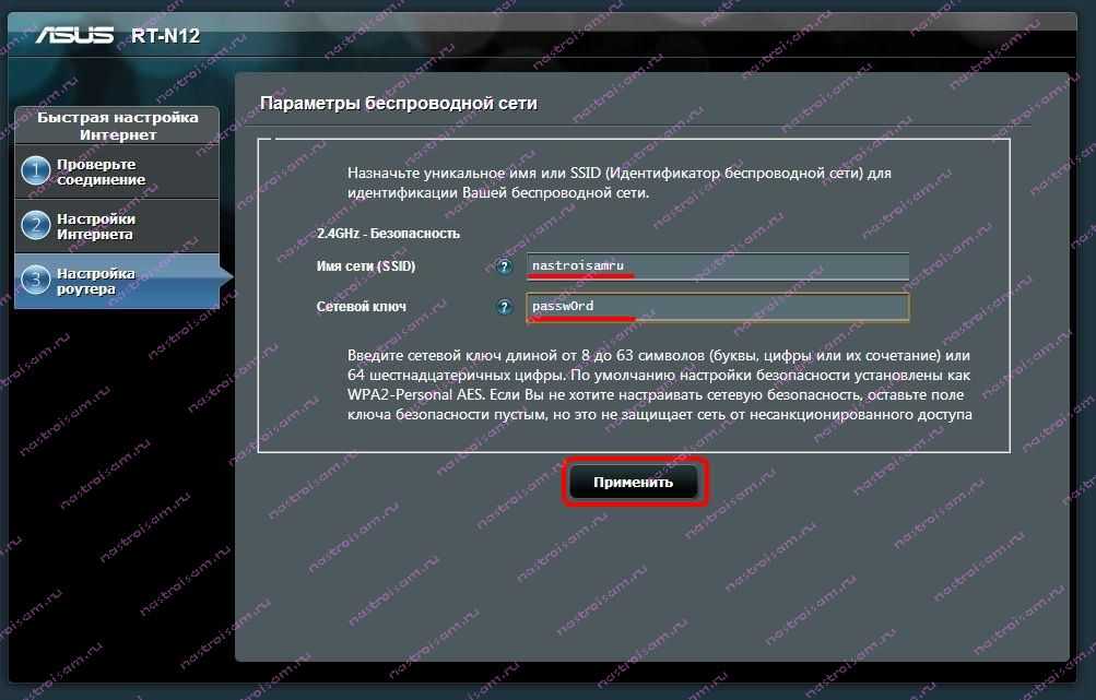 На этом шаге роутер просит ввести имя беспроводной сети — SSID и в поле «Сетевой ключ» — пароль на WiFi. В качестве имени сети можно использовать любое слово на латинице. В качестве ключа сети можно использовать любой набор символов, длиной не менее 8. Нажимаем кнопку Применить.
