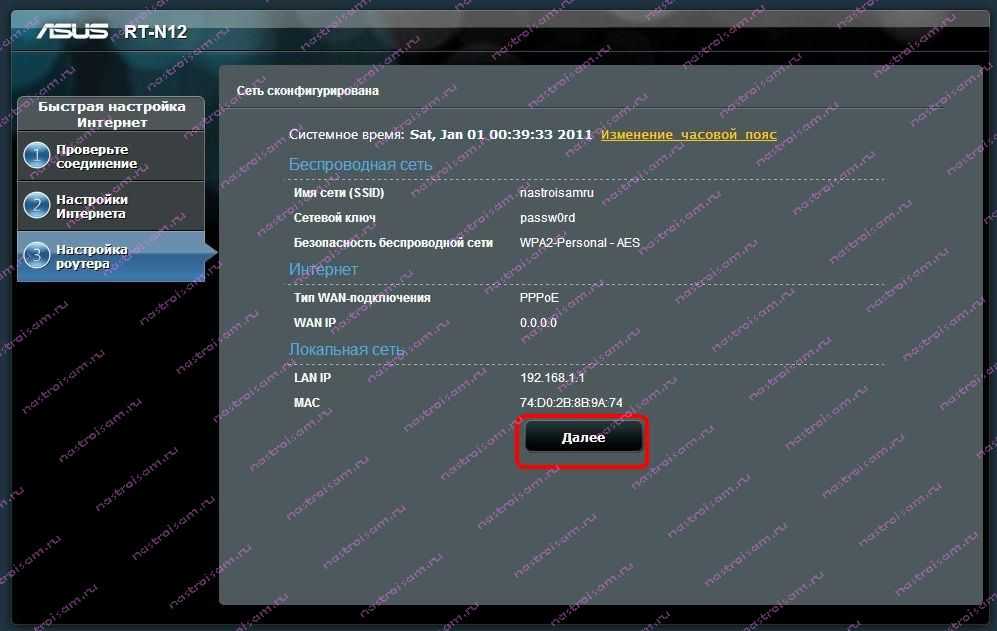 После подключения вернитесь снова к настройкам. Должно появится окно с информацией о подключении. Нажмите Далее.