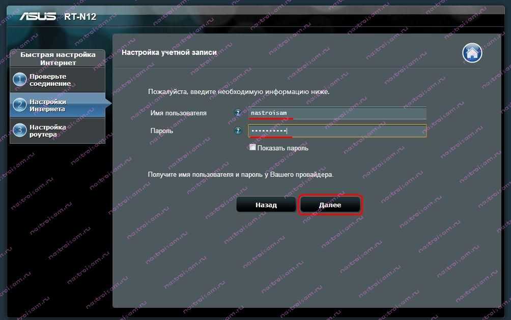 Для удобства можно поставить галочку «Показать пароль». Нажимаем кнопку «Далее».