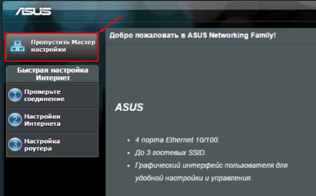 Сразу хочу предупредить, что на моделях с поддержкой N и AC в быстрой настройке не удобно конфигурировать интернет подключение. Поэтому если вы видите вот такую картину как на скриншоте ниже, то нажмите по кнопке «Пропустить Мастер настройки» и перейдите к следующей главе «Ручная настройка».