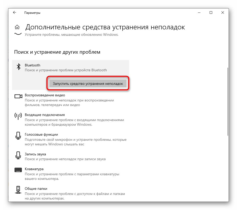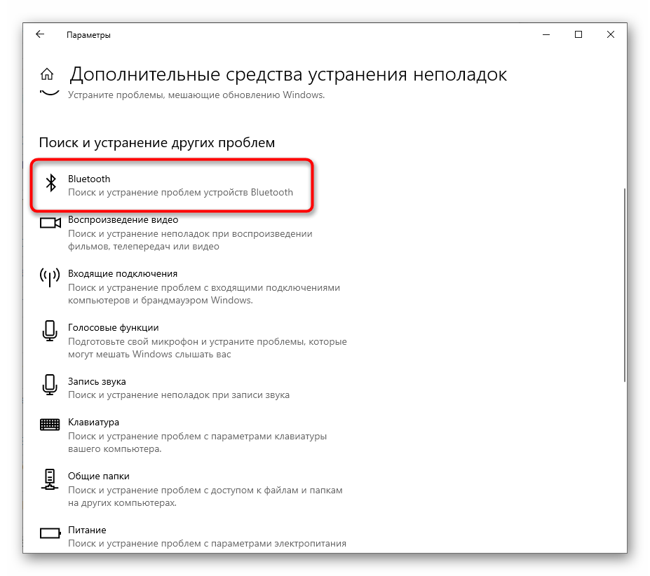 В списке «Поиск и устранение других проблем» вас интересует категория «Bluetooth». Если она отсутствует, сразу же переходите к Способу 3, где говорится о загрузке драйверов оборудования.