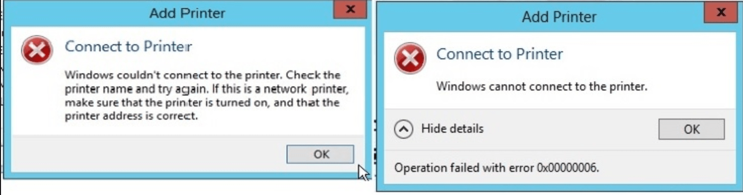 Код ошибки может быть разный: 0x00000057, 0x00000002, 0x0000000a, 0x00000006, 0x00000214, 0x0000007e и т. д. Появляется обычно на этапе подключения и настройки сетевого принтера.