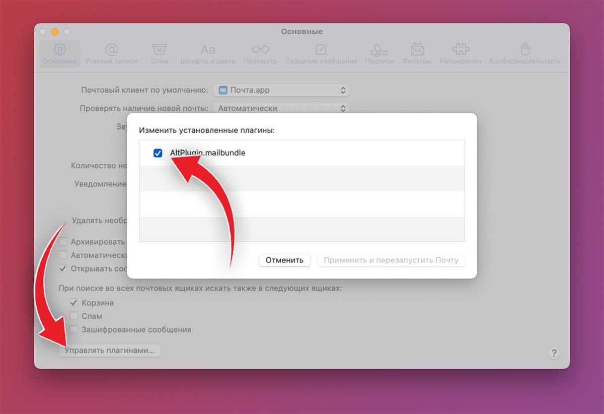 Активируйте плагин в параметрах почтового клиента (Настройки – Основные – Управлять плагинами…).